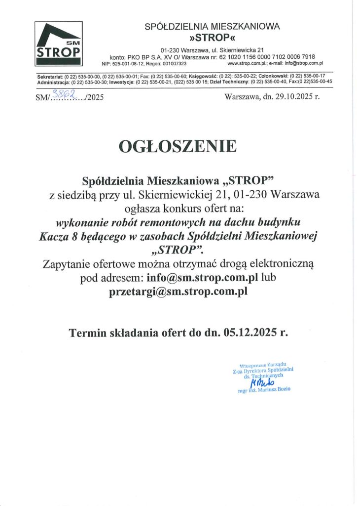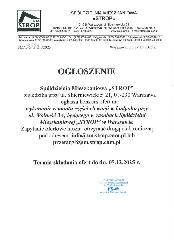 Spółdzielnia Mieszkaniowa "Strop" aktualne informacje ogłoszenie zawiadomienie ogłoszenia Ogłoszenia więcej Konkursy więcej praca więcej eBOK (portal czynszowy) Sprawdź rozliczenia i wpłaty więcej Strefa Mieszkańca Dokumenty przeznaczone dla mieszkańców więcej kontakt Ważne telefony w jednym miejscu więcej galeria Samolotowa Kacza I Kacza II Górczewska-Narwik Płocka 15 Szeligowska Żelazna Żytnia Bellottiego 5 więcej zdjęć Spółdzielnia Mieszkaniowa "Strop"